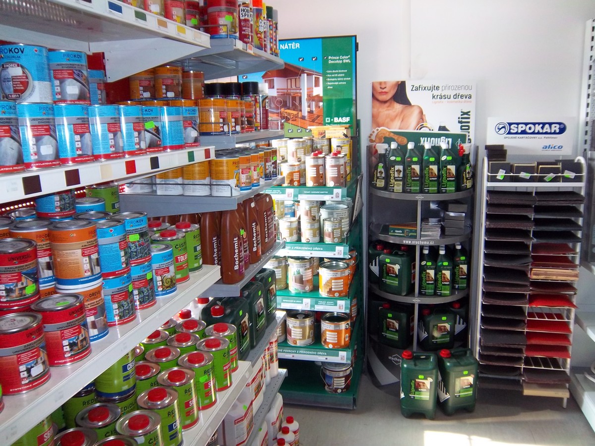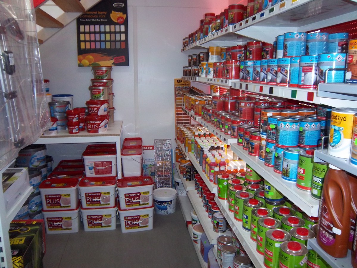 malby, penetrace, akrylátové barvy, syntetické barvy, laky (akrylátové, nitro, syntetické, alkydové), ředidla, fermež, latex, benzínové čističe, tmely, štětce, válečky, zakrývací fólie, pásky
