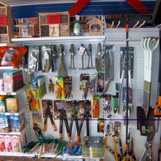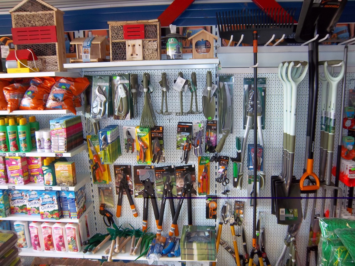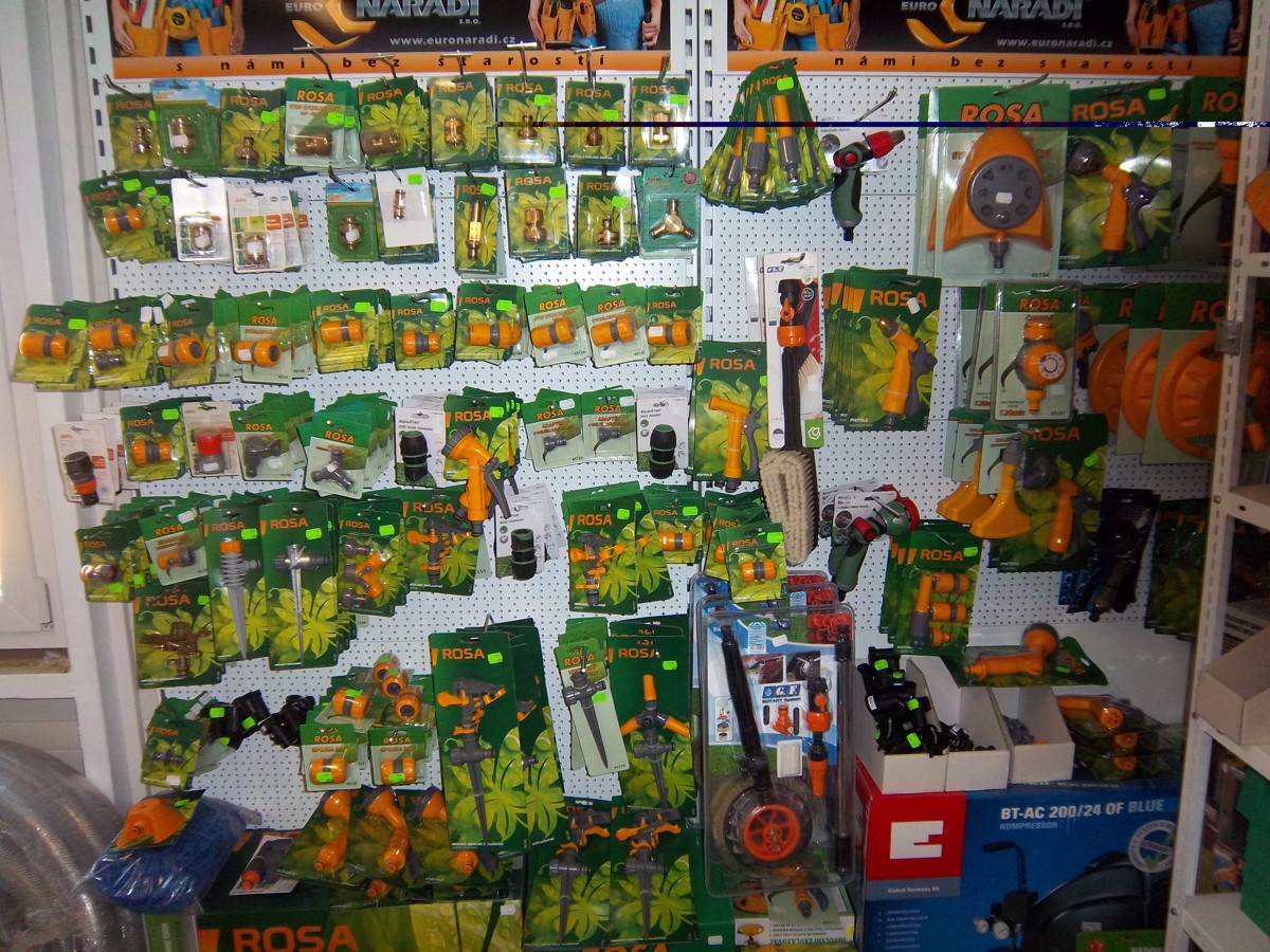 sekačky, kultivátory, vertikutátory, křovinořezy, válce, nůžky, srpy, kosy, hrábě, rycí vidle, motyky, postřikovače, pily, sekyry, kompostéry, konve, hadice, kompletní program rosa, žebříky, postřiky, hnojiva, netkané a stínící tkaniny, zemina, mulčovací kůra, kačírek, dekorační kamenivo, žulové kostky, písek obyčejný a křemičitý, bazénová chemie, dřevěné uhlí a brikety, pilinové brikety