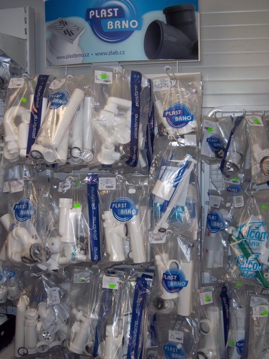 odpadní potrubí HT a KG včetně tvarovek, vodovodní potrubí PE, PP, Cu včetně tvarovek, kohouty bateri , roháčky, WC mísy, umyvadla, těsnění, izolace potrubí, domácí vodárny, vodovodní šachty, drenážní potrubí