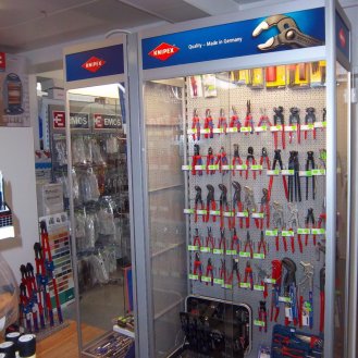 Kabely , chráničky, krabice, vypínače, zásuvky, světla, zvonky, čidla, ventilátory, žárovky, úsporné zdroje, prodlužky, instalační lišty, zemnící pásky, hromosvody, zemnící tyče, rozvodné skříně, spojovací materiál
